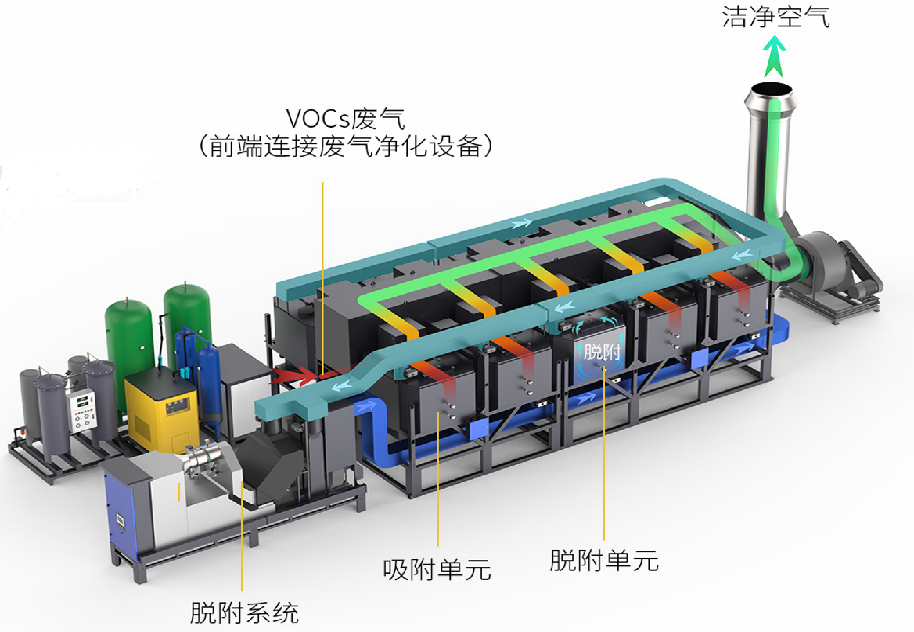 利用活性炭模塊對揮發(fā)性有機廢氣進行吸附收集,吸附達到一定程度后,再用熱氣流把高濃度的VOC從活性炭模塊中脫附出來,進入催化氧化爐(CO)中進行無焰燃燒,最終把有機廢氣分解成CO2和H2O,再生后的活性炭恢復對有機物的吸附能力,從而達到 對有機廢氣凈化的目的。